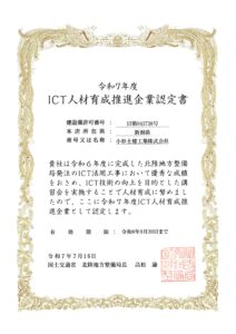国土交通省 北陸地方整備局 様より『令和7年度 ICT人材育成推進企業認定書』をいただきました。